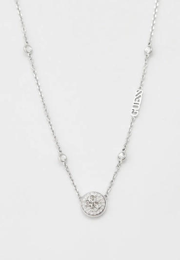 Главным акцентом украшения является круглая подвеска в форме монеты. На ее поверхности искусно выгравирован фирменный логотип бренда Guess (символ 4G), что подчеркивает принадлежность к известному модному дому. Детали подвески также инкрустированы мелкими кристаллами, обрамляющими логотип и усиливающими сияние.